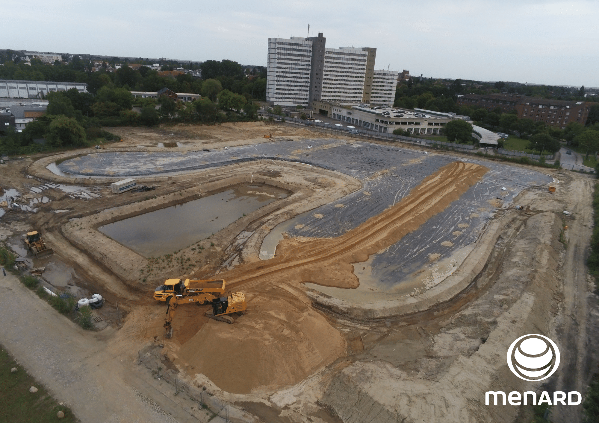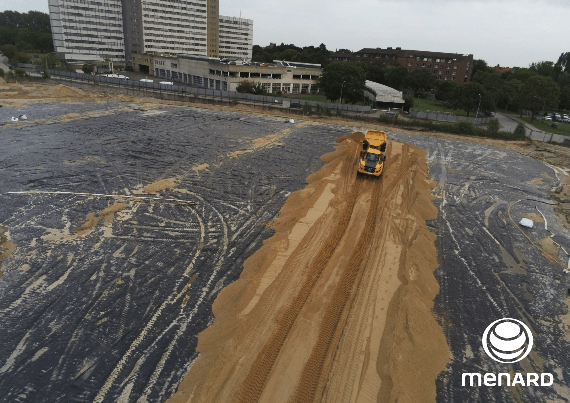 Für die Erschließung des Geniner Ufer in Lübeck wurden wir mit der Ausführung von unserem MVC® (Menard Vacuum Consolidation) beauftragt. Bei der Baugrunderkundung wurden im Bereich des Baufeldes große Weichschichtmächtigkeiten von Torfen und unterschiedliche Vorbelastungsbedingungen durch Altbebauung festgestellt.