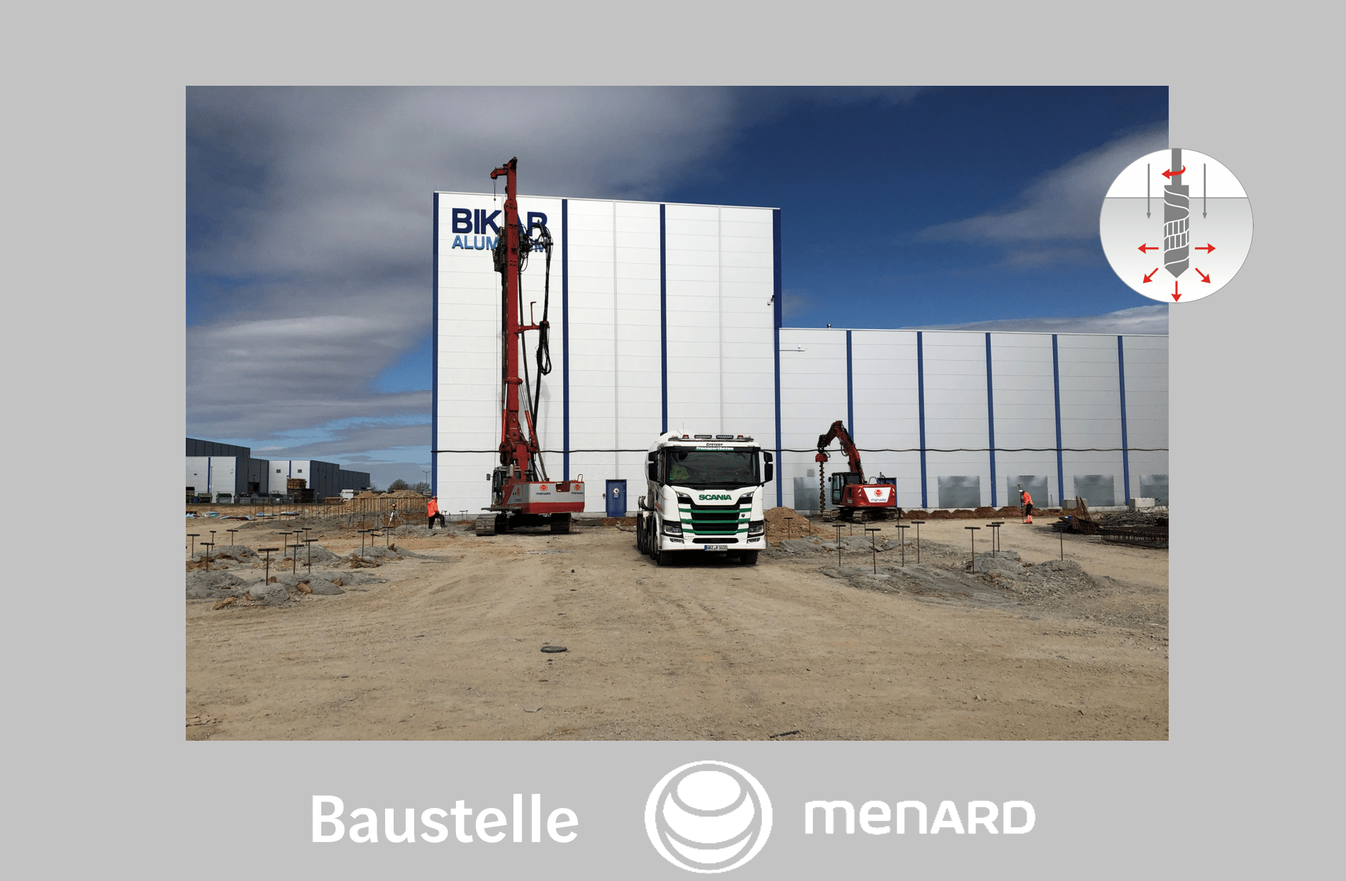Die Anordnung der CMC®-Säulen erfolgt im Raster, in Kombination mit einer Lastverteilungsschicht, sodass Einsparungen in der Bodenplatte innerhalb der Plattendicke und Bewehrung gegenüber einer Pfahlgründung erzielt wurden.